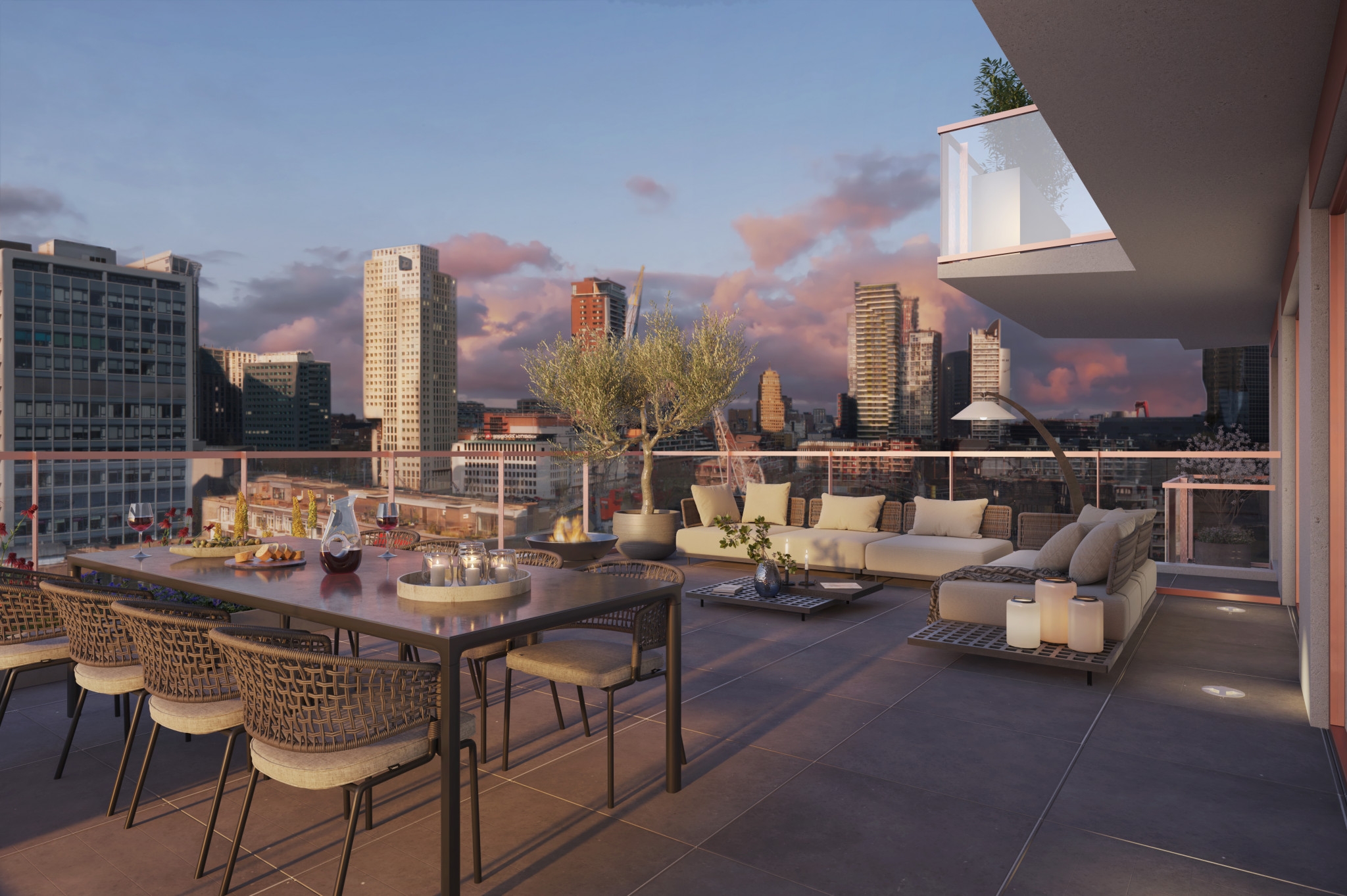 De Penthouses op de 22ste en 23ste verdieping hebben rondlopende balkons en verdiepingshoge ramen, waardoor je de stad echt ervaart als je eigen achtertuin! Voor wie dit nog niet genoeg is, heb je ook toegang tot de gemeenschappelijke daktuin op de zevende verdieping.